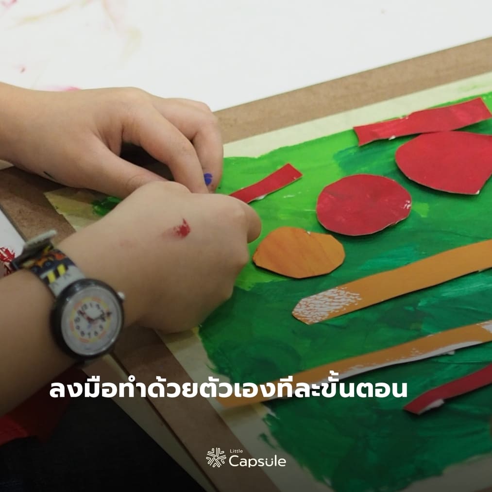 งานศิลปะจากการระบายสีและตัดแปะ ไม่เพียงแต่ได้ผ่อนคลายและสนุกไปกับครูผู้สอน เด็กๆ ยังได้เรียนรู้กระบวนการทำงานแบบเป็นขั้นเป็นตอน เริ่มจากการวางแผน คิด วิเคราะห์ และลงมือทำด้วยตัวเอง โดยที่ครูผู้สอนเป็นเพียงผู้ให้คำแนะนำชวนคิดให้เกิดกระบวนการการเรียนรู้ในทักษะต่างๆ และความคิดสร้างสรรค์